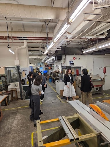 의류학과팀은 세계적으로 패션·텍스타일 연구 분야에서 높은 평가를 받고 있는 홍콩이공대학교(The Hong Kong Polytechnic University, PolyU)를 방문하여, PolyU의 최첨단 실습실과 연구 시설을 견학하였다. PolyU 내 디자인스쿨(School of Design)을 먼저 방문하여, 글로벌 디자인 교육을 선도하는 연구 환경을 직접 살펴보았다. 디자인스쿨은 브랜딩, 인터랙션 디자인, 미디어 아트, 제품 디자인 등 다양한 창의 분야가 유기적으로 융합된 교육 체계를 갖추고 있어 디자인 사고가 학제적으로 확장되는 과정을 확인할 수 있었다. 특히 레이저 커팅 장비, 3D 프린터, 디지털 패브릭 제작 장치 등 기술 기반의 실험적 창작을 가능하게 하는 제작 스튜디오(Maker Space)를 견학하며, 첨단 기술이 디자인 교육과 연구에 어떻게 통합되는지를 생생하게 이해할 수 있었다.